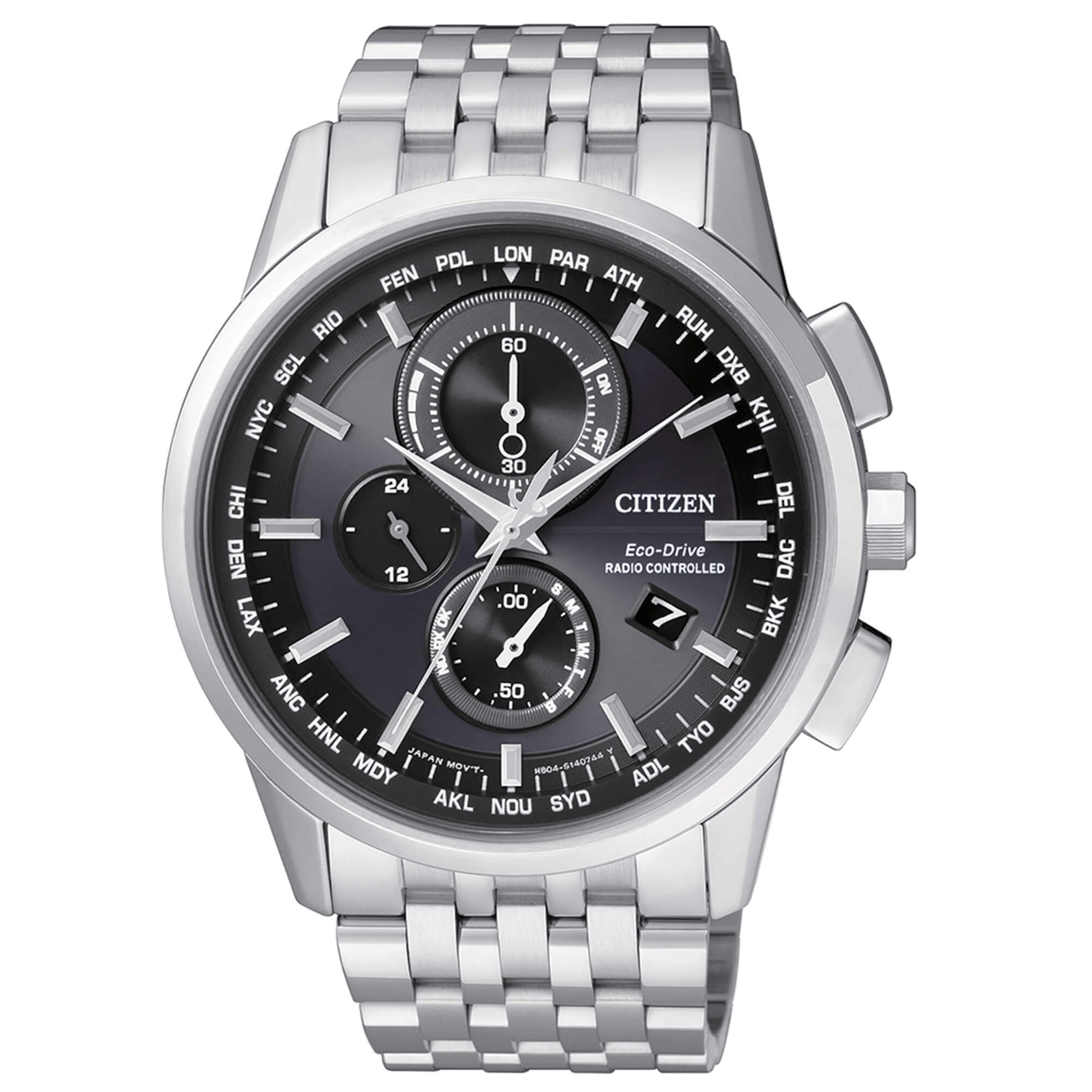 Radiocontrollato a 5 canali: ricezione segnale orario USA, Europa, Giappone, Cina. World time con orario di 26 città del mondo e ora UTC. Cronografo a 1/5 di sec. Calendario perpetuo.