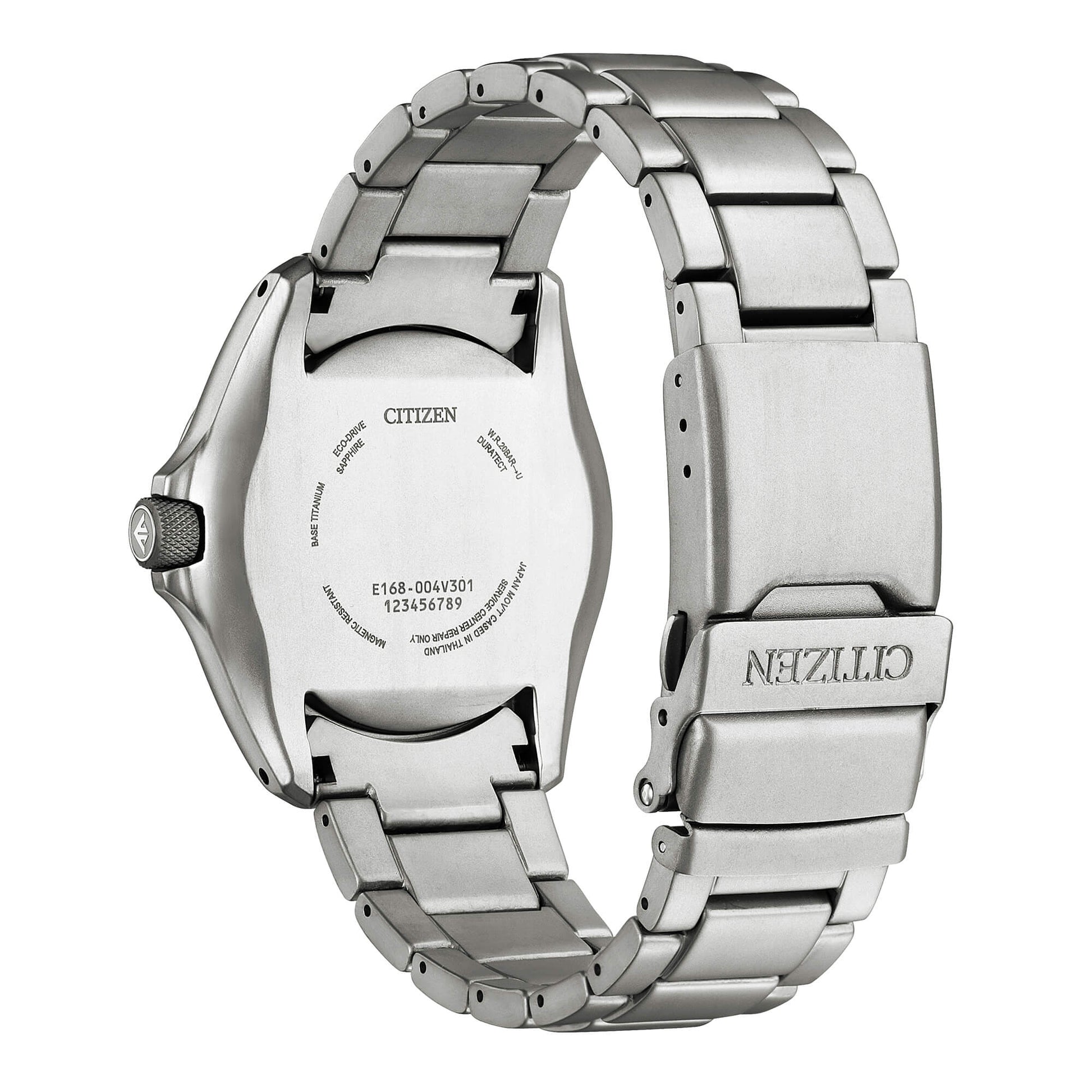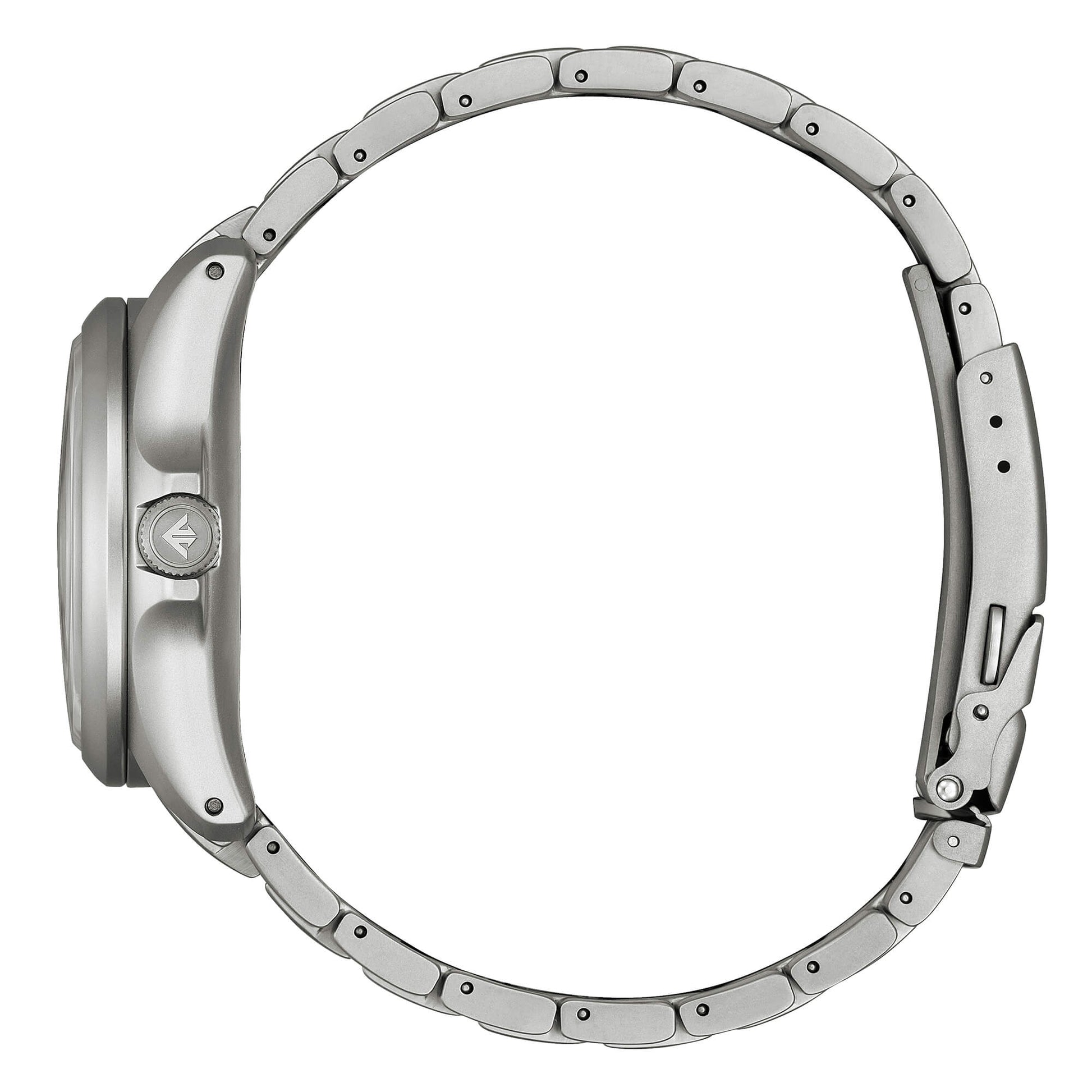 Cassa realizzata in monoblocco in Super Titanio con corona serrata a vite. Vetro zaffiro sferico con trattamento antiriflesso. Bracciale in Super Titanio con chiusura di sicurezza. Quadrante con indici e numeri ad alta visibilità. WR 20 bar.